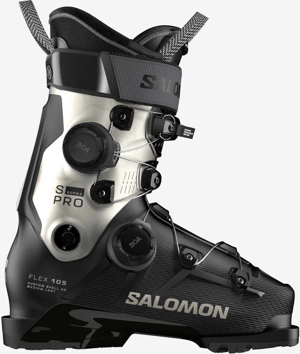 Salomon's S/Pro Supra Dual BOA® 105 women's boots revolutionize micro-adjustable sensitivity. Featuring a women-specific cuff and two BOA® dials, these boots deliver a customized fit, providing optimal support at the cuff and precise comfort in the lower shell. The result? Enhanced performance that keeps women comfortable on every slope.