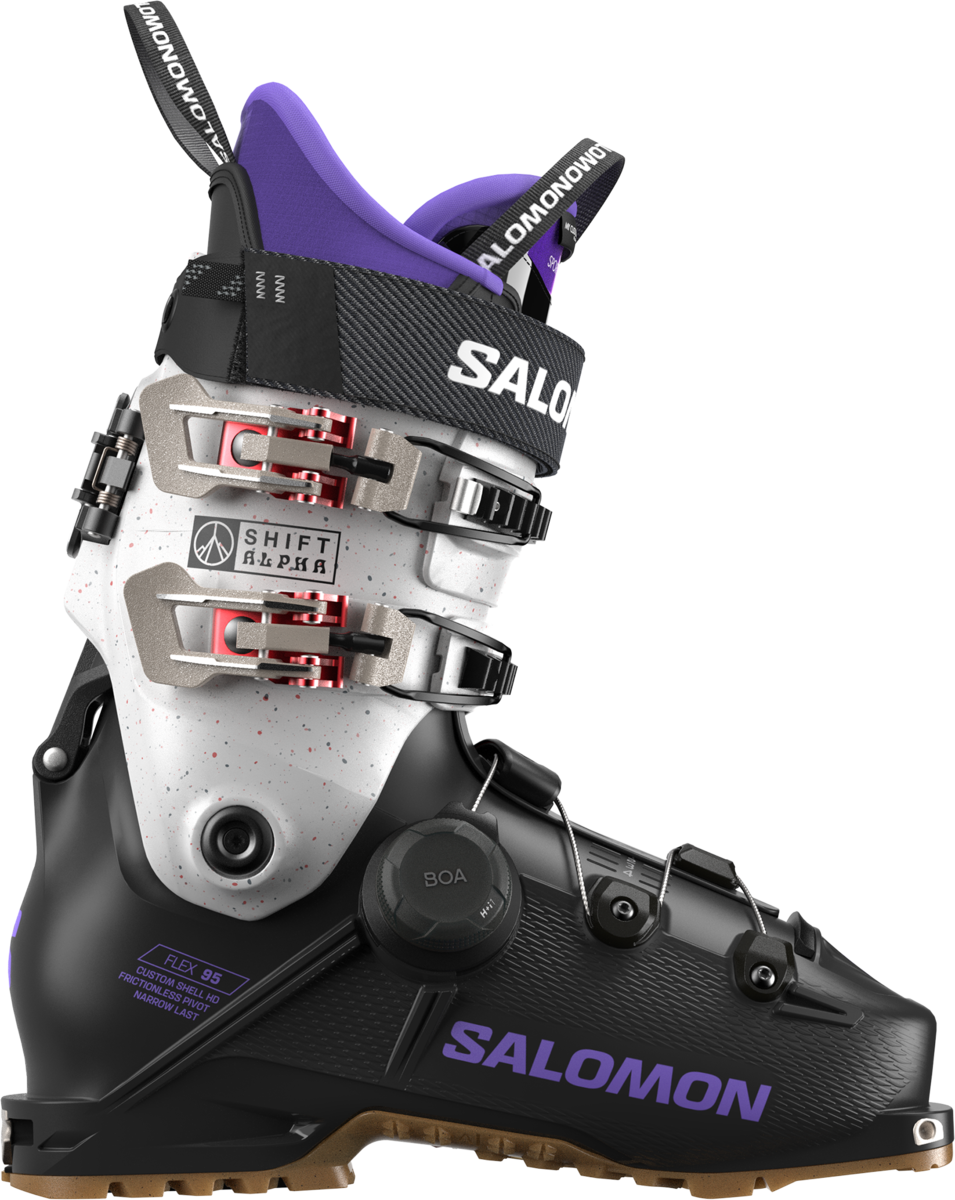 Salomon's Shift Alpha BOA® 95 women's boots blend freeride versatility with alpine expertise for more enjoyment both uphill and downhill. The FreeSpine™ connecting cuff and shell enhances power and control, while the Exobelt™ and BOA® Fit System provide a micro-adjustable, precision fit and a targeted foot-wrap easily adjusted throughout the day.